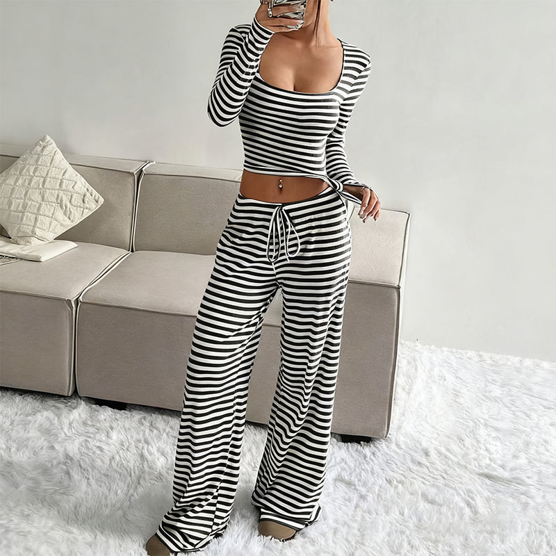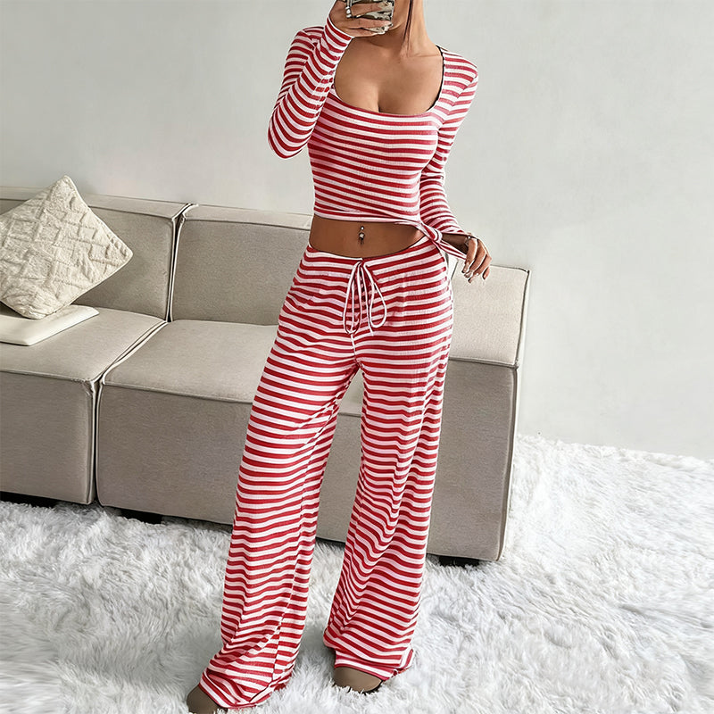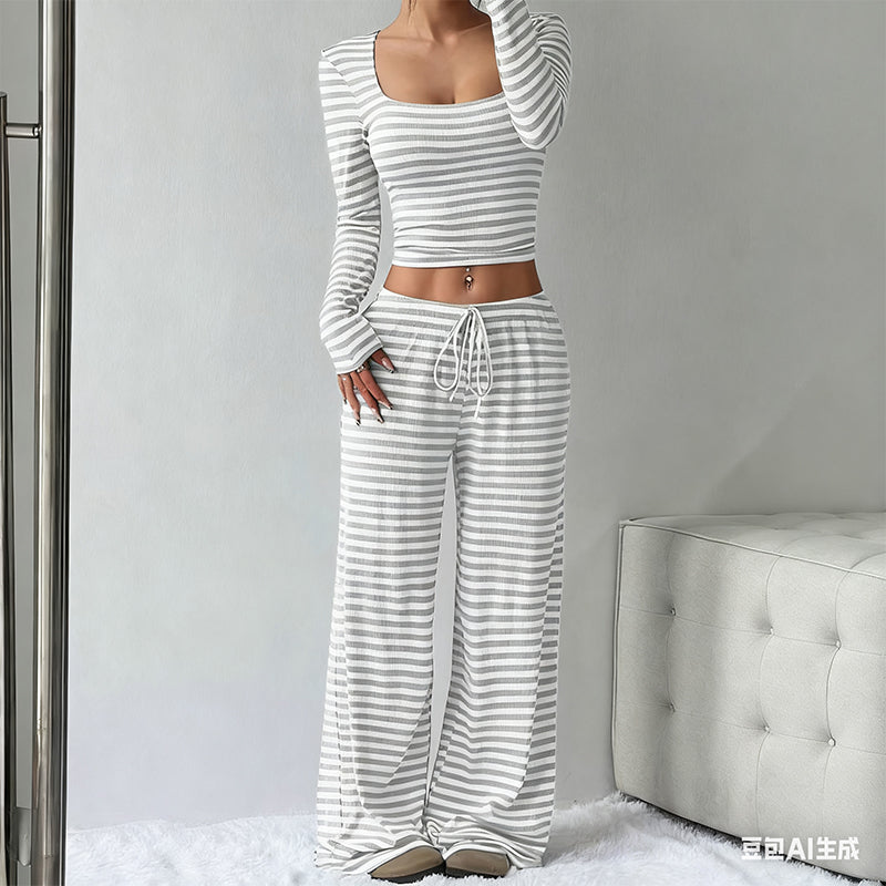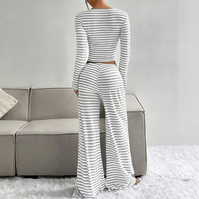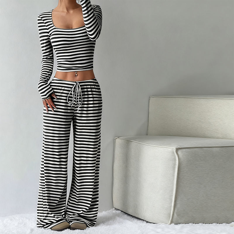 Striped Knit Slim Fit Top & Wide-Leg Pants Set